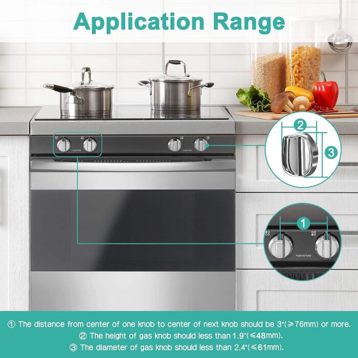 • 5. [Application Range] Please measure the stove knob before purchase, otherwise it may can not be used. The distance from center of 1 knob to center of next knob should be 3″(≥76mm) or more. The height of gas knob should less than 1.9″(≤48mm). The diameter of gas knob should less than 2.4″(≤61mm).